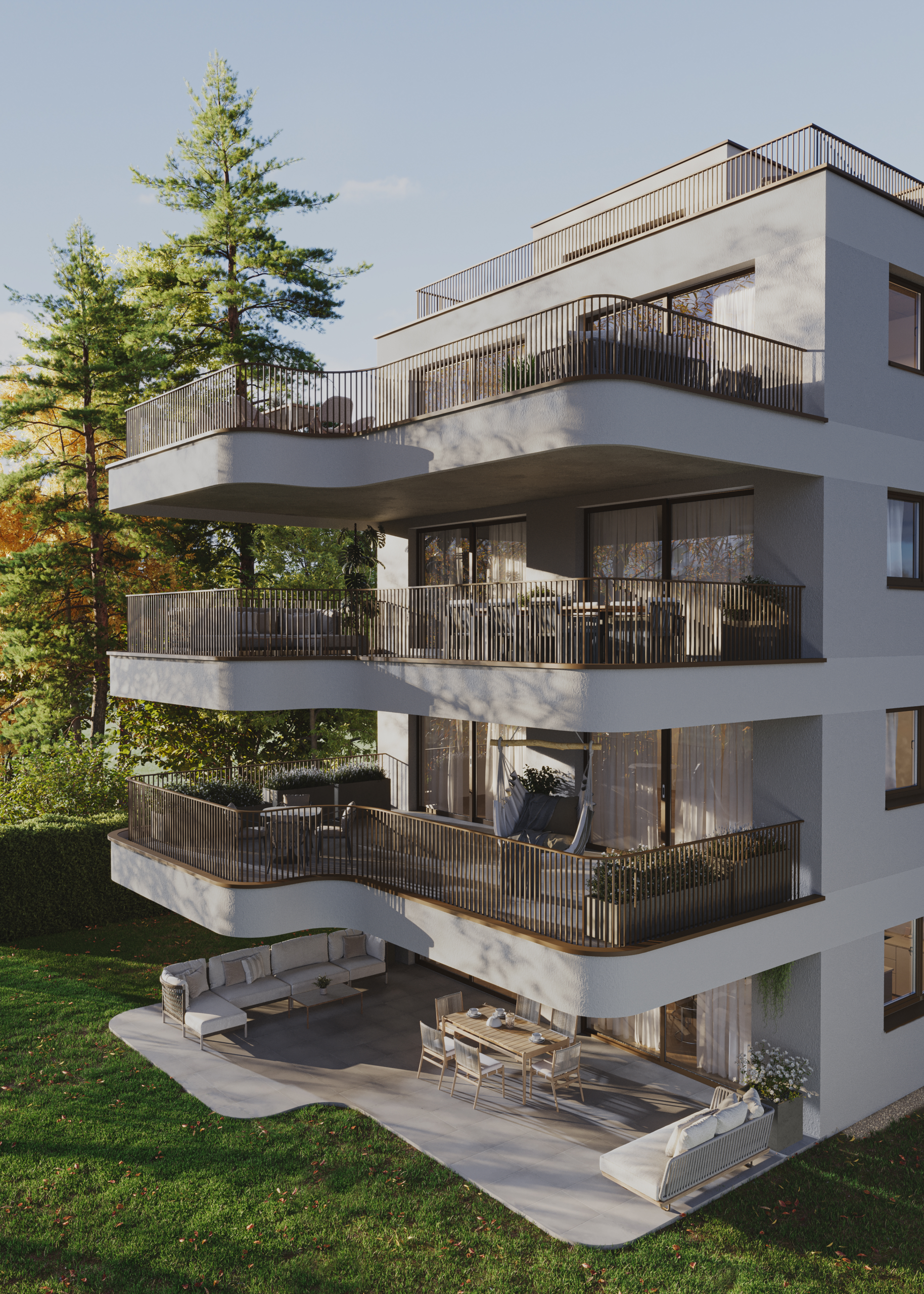 Prägend sind die abgerundeten Balkone aus Sichtbeton, die dem Baukörper eine plastische Tiefe verleihen und zugleich private Freiräume schaffen.