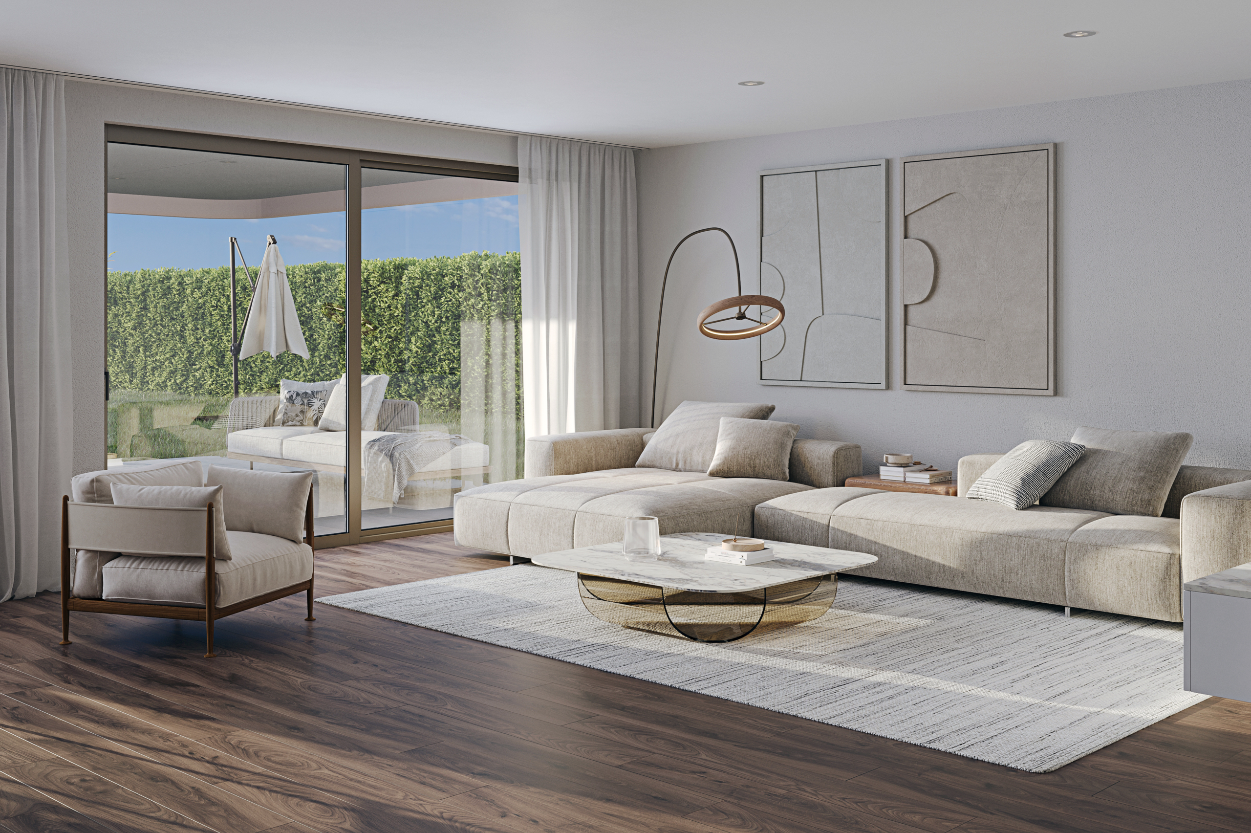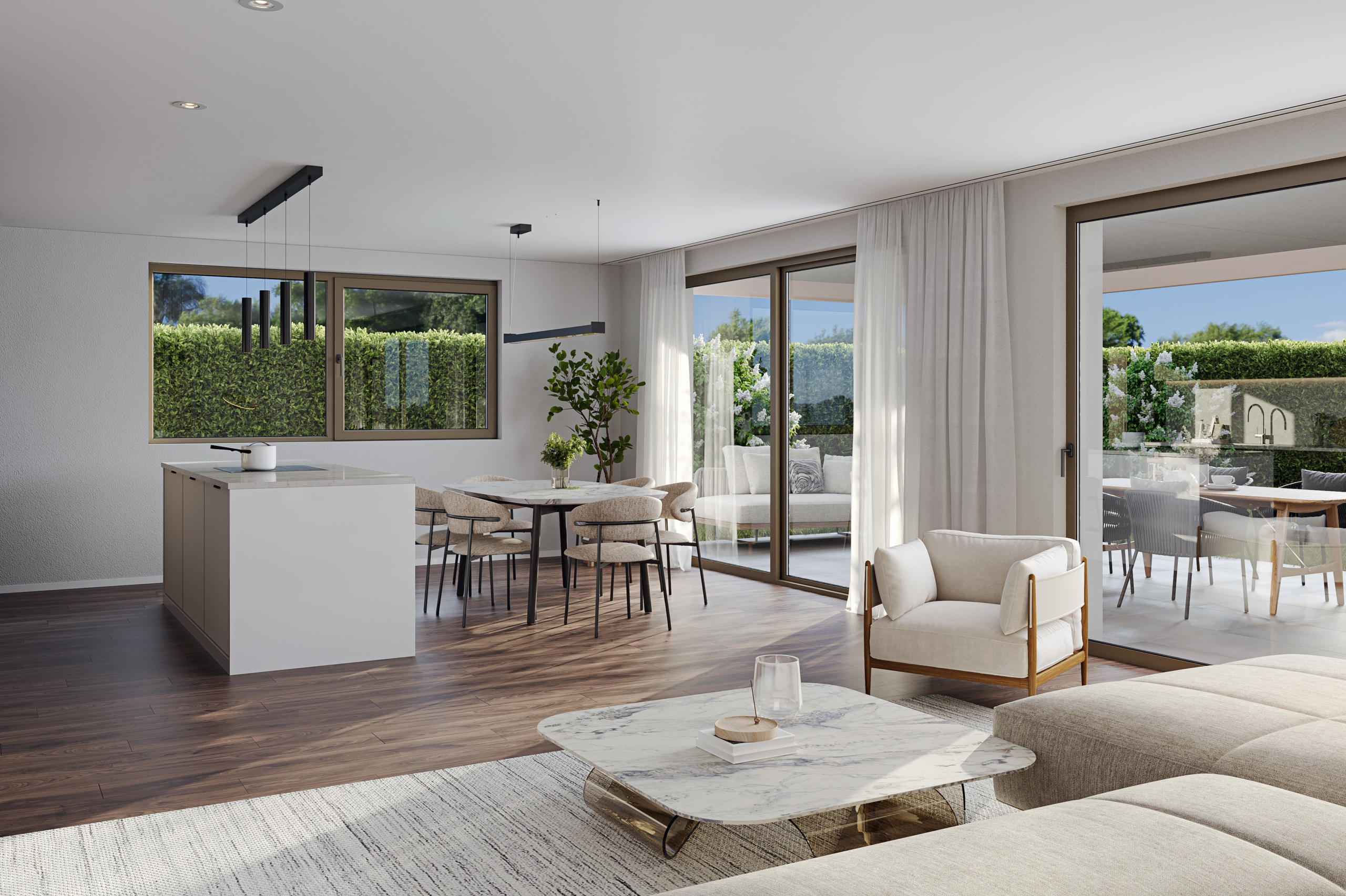 Ein gemeinsam genutzter Gartenbereich stärkt das nachbarschaftliche Zusammenleben und bildet die grüne Verlängerung des Wohnraums.