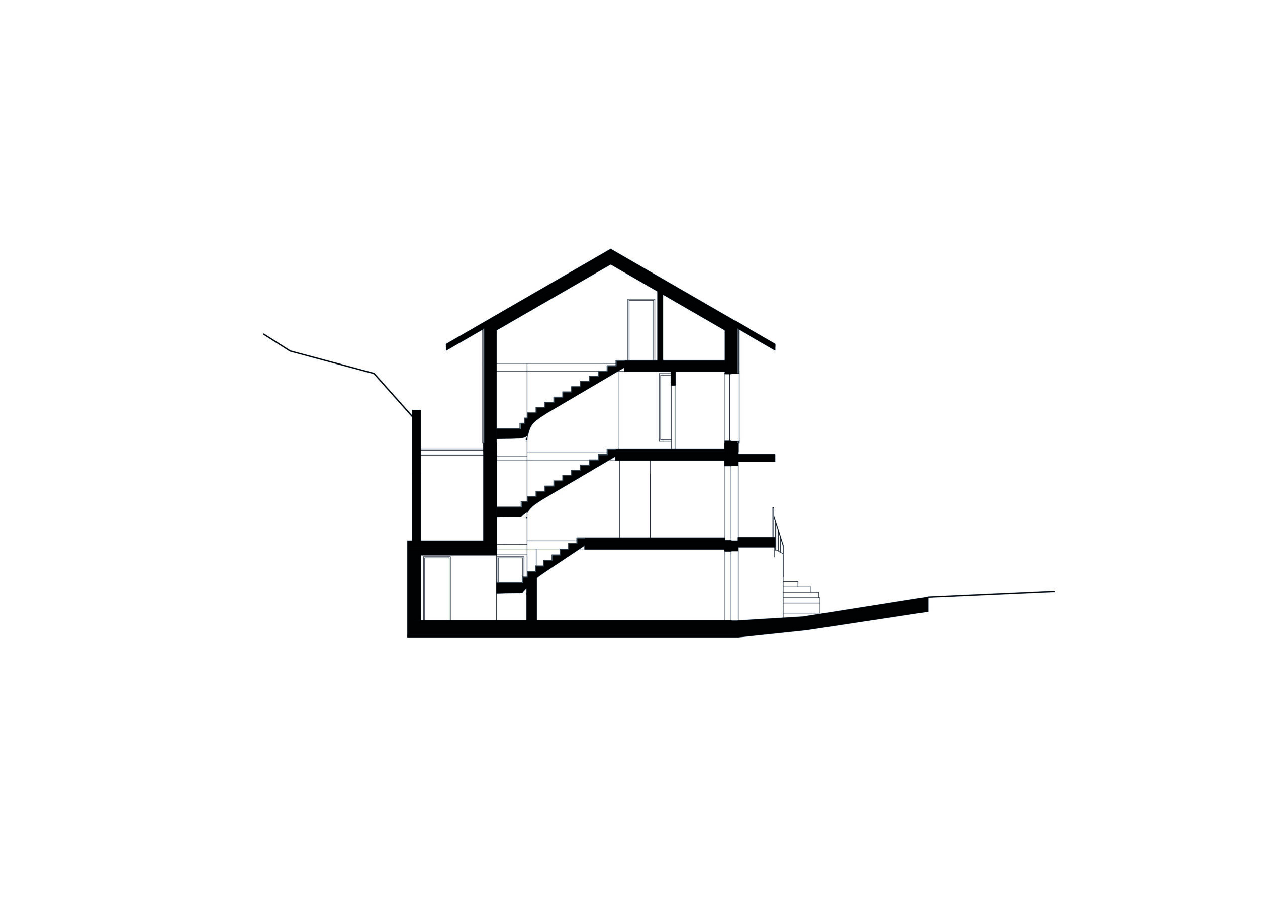 Der Baukörper präsentiert sich massiv und robust, fast wie ein Fels in der Landschaft. Ein grober Anwurf-Putz verleiht ihm Charakter und Erdung – Architektur, die Bestand hat und sich zugleich selbstverständlich ins Umfeld integriert.